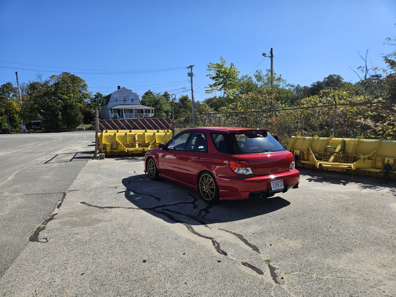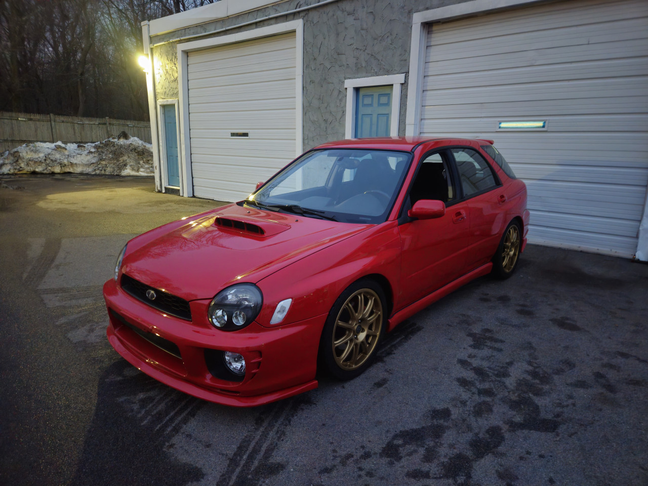 Originally this was an 05 WRX Wagon with an Automatic transmission. It has since been fully converted to an 02 WRX with an STI 6 speed. The extensive body work features San Remo Red paint, Full 02 WRX sedan front end conversion, 02 WRX Sedan quarter panels grafted to the wagons body among many other small details. The engine in the car is a stock ej205 with a BPT turbo and supporting mods. It also has an 06 sti transmission installed with the new iWire IDCCD. Suspension wise, the car has all STI control arms to match the body work, ST Coilovers, Upgraded sway bars, an STI steering rack, and many more additions. This car was built mechanically by myself, and the body work by Factory Collision in Weymouth, to resemble what I believe Subaru should have released to the public in 02 for the WRX Wagon. Sorry i only have one photo of the interior but it is based in the 05 WRX with Black carpet, seats, and trunk to match. The dashboard, center console, and door panels are all 02 WRX to match the body harness installed in the car and my preference.